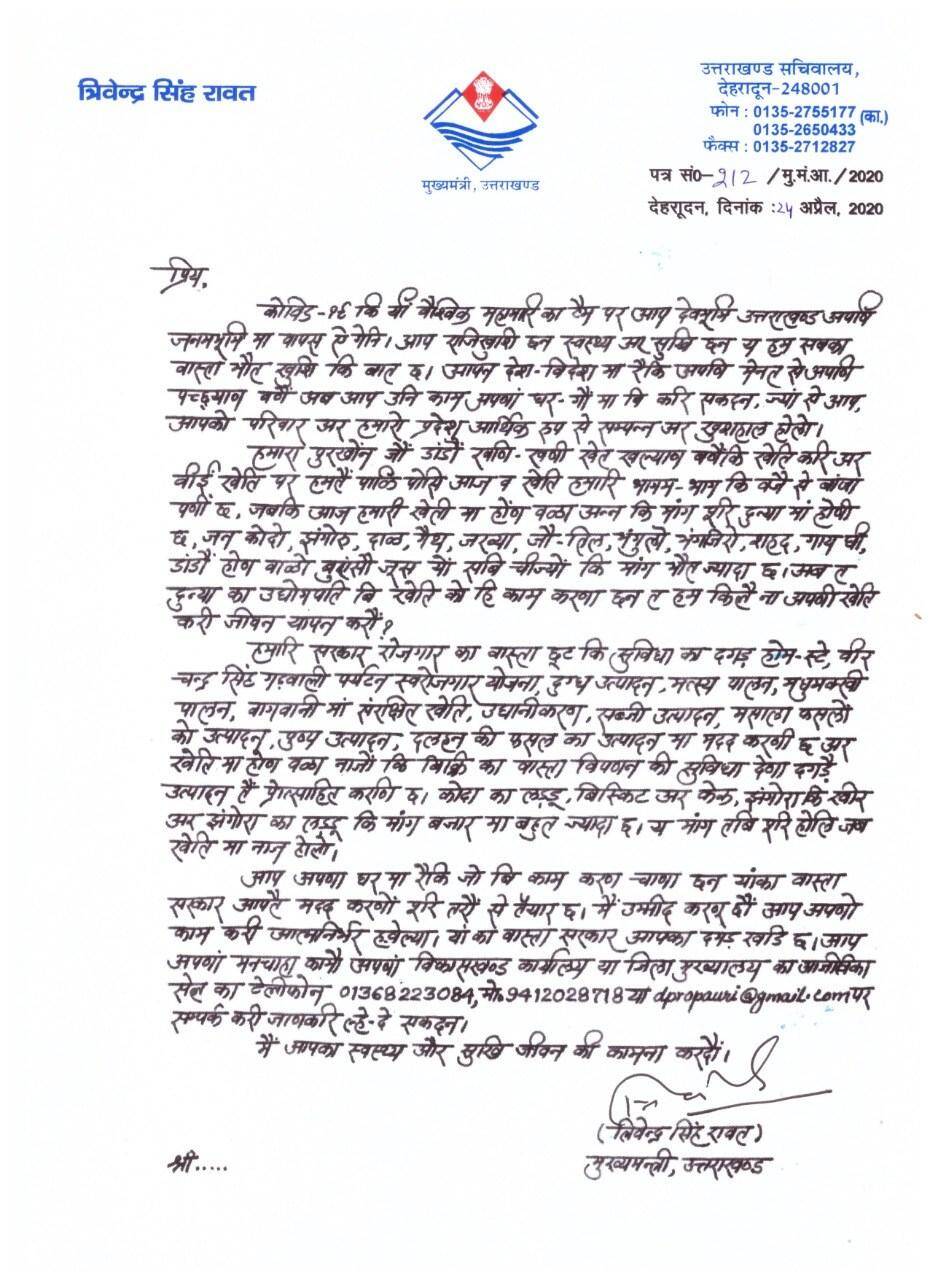 लॉकडाउन होने पर उत्तराखंड के 10 पर्वतीय जिलों के गांवों में करीब 60 हजार प्रवासी लौटे हैं। जिसके बाद राज्य सरकार सक्रिय हो गई है। मुख्यमंत्री ने शुक्रवार को प्रवासियों के नाम गढ़वाली में पत्र जारी करते हुए कहा कि प्रवासियों ने देश-विदेश में अपनी मेहनत से अलग पहचान बनाई है। अब वे यही कार्य अपने घर गांव में भी कर सकते हैं। मुख्यमंत्री ने कहा कि हमारे पूर्वजों ने पहाड़ काटकर खेत बनाए और इन्हें उपजाऊ बनाकर हमारा पालन-पोषण किया है। आज खेती भागम-भाग की जिंदगी के कारण बंजर पड़ी है, जबकि हमारे कृषि उत्पादों की मांग दुनियाभर में हो रही है। आज दुनिया के उद्योगपति भी खेती पर ध्यान दे रहे हैं तो क्यों न हम भी अपनी खेती को जीवनयापन का आधार बनाएं।