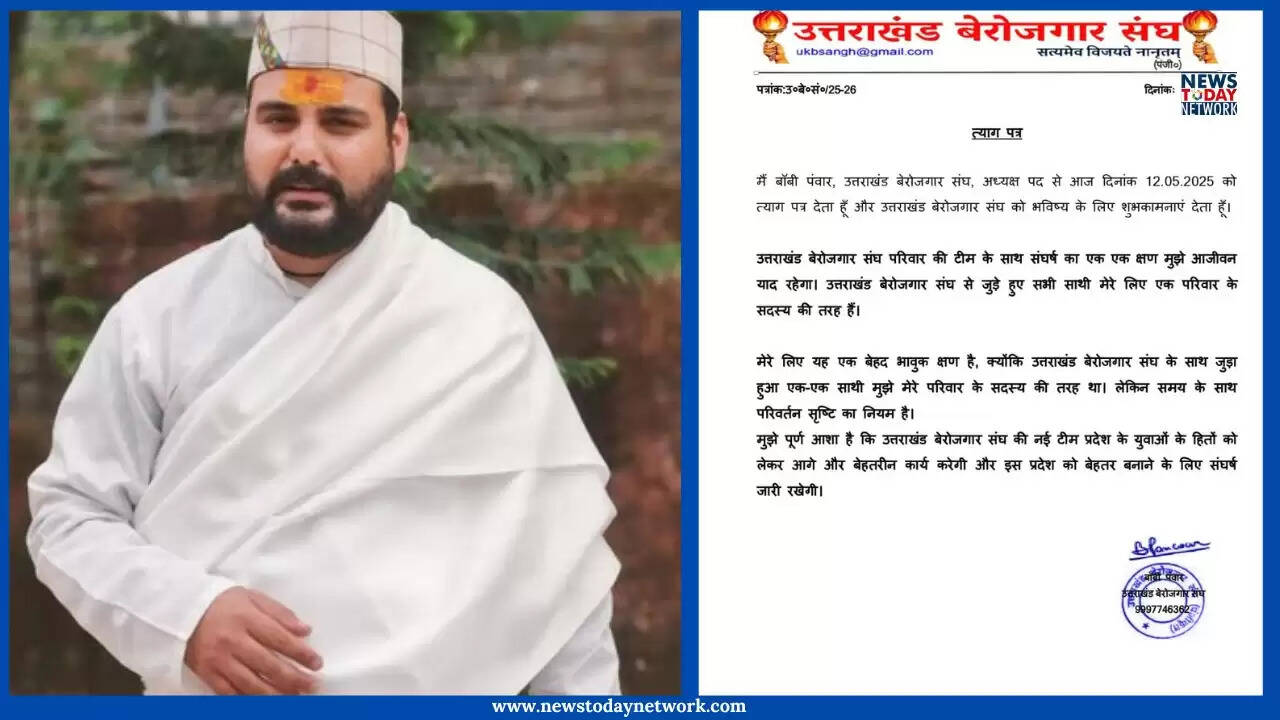 देहरादून - उत्तराखंड बेरोजगार संघ के अध्यक्ष बॉबी पंवार ने अपने पद से इस्तीफा दे दिया है। उन्होंने यह जानकारी सोशल मीडिया के ज़रिए साझा करते हुए अपने 7-8 साल के संघर्ष की दास्तान और उपलब्धियों को याद किया। पंवार के मुताबिक, उन्होंने यह कदम संघ की "गैर-राजनीतिक" छवि को बनाए रखने के लिए उठाया है, क्योंकि अब वे स्वयं एक राजनीतिक चेहरे के रूप में उभर चुके हैं।