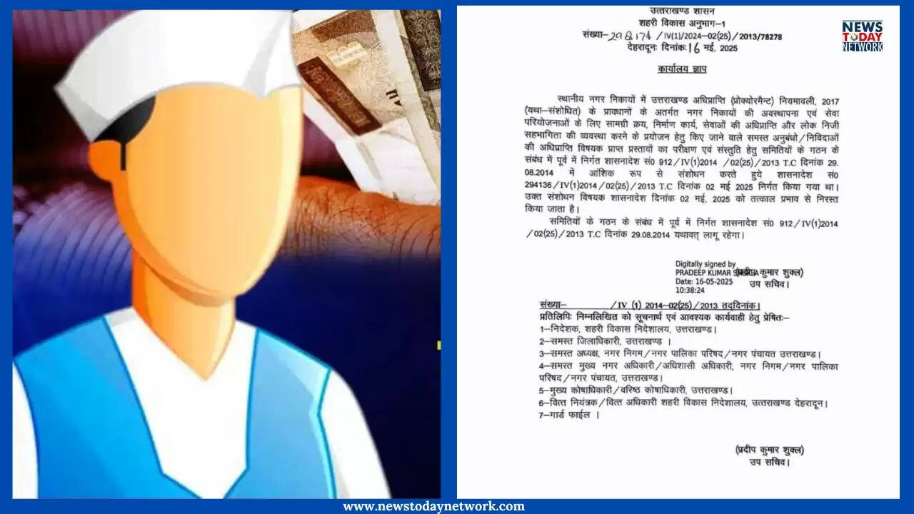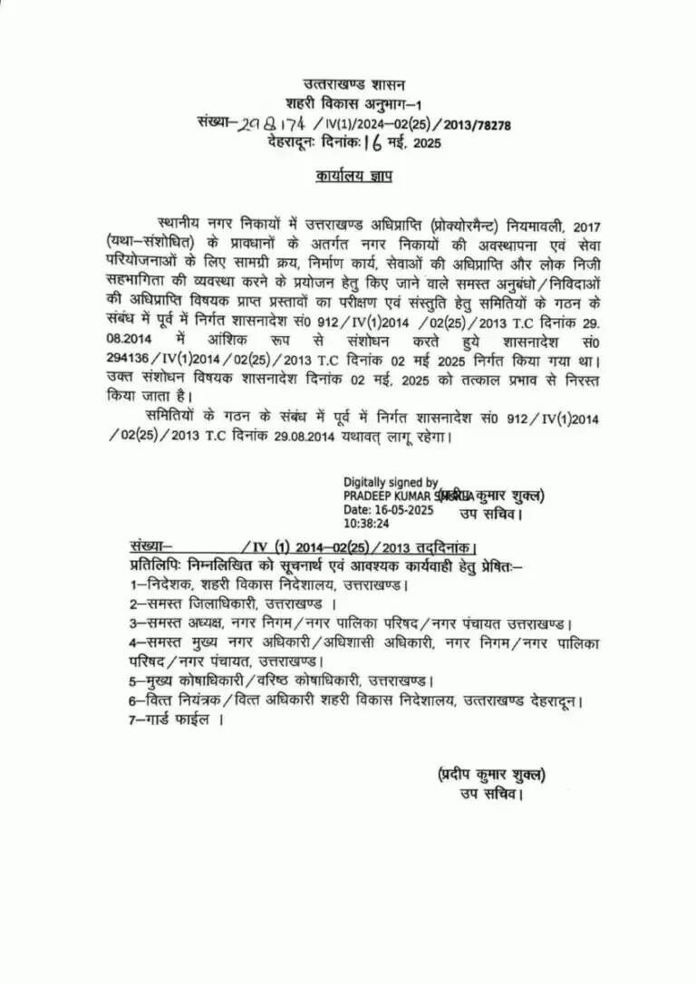 देहरादून, 16 मई 2025 — उत्तराखंड सरकार ने शहरी निकायों की टेंडर कमेटियों से मेयर और पालिकाध्यक्षों को बाहर करने वाले 2 मई को जारी शासनादेश को निरस्त कर दिया है। मुख्यमंत्री पुष्कर सिंह धामी के निर्देश के बाद शहरी विकास विभाग ने नया आदेश जारी करते हुए मेयर और अध्यक्षों को पुनः टेंडर कमेटियों में शामिल करने का निर्णय लिया है।