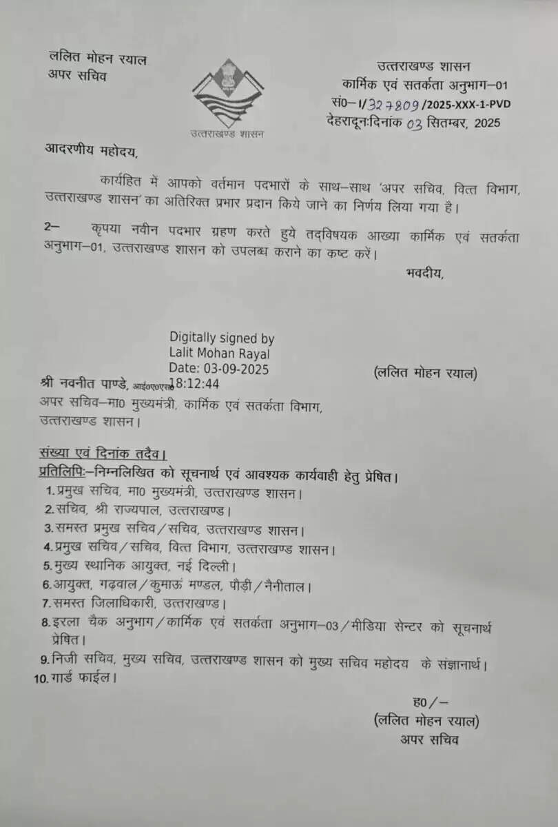 देहरादून - उत्तराखण्ड शासन ने एक महत्वपूर्ण प्रशासनिक निर्णय लेते हुए वरिष्ठ अधिकारी नवनीत पांडे को उनके वर्तमान पदभारों के साथ-साथ ‘अपर सचिव, वित्त विभाग, उत्तराखण्ड शासन’ का अतिरिक्त प्रभार सौंपा है।