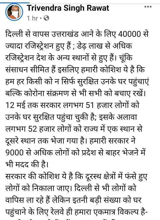 सीएम ने अपने फेसबुक पर पोस्ट करते हुए लिखा दिल्ली से वापस उत्तराखंड आने के लिए 40 हजार से ज्यादा रजिस्ट्रेशन हुए हैं। डेढ़ लाख से अधिक रजिस्ट्रेशन देश के अन्य स्थानों से हुए हैं। चूंकि संसाधन सीमित हैं। इसलिए हमारी कोशिश ये है कि हम हर किसी को न सिर्फ सुरक्षित उनके घर पहुंचाएं बल्कि कोरोना संक्रमण से भी सभी को बचाए रखें। 12 मई तक सरकार लगभग 51 हजार लोगों को उनके घर सुरक्षित पहुंचा चुकी है। इसके अलावा लगभग 52 हजार लोगों को राज्य में एक स्थान से दूसरे स्थान तक भेजा गया है। हमारी सरकार ने 9000 से अधिक लोगों को प्रदेश से बाहर भेजने में भी मदद की है।