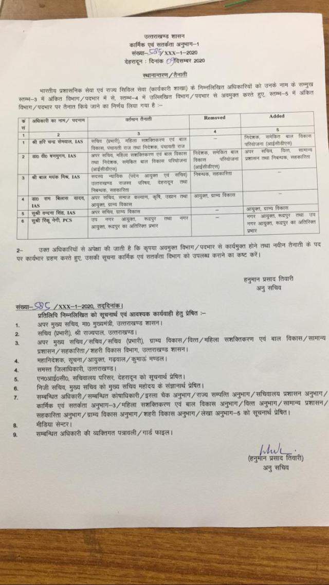 देहरादून-पांच IAS और एक PCS का तबादला, देखिये पूरी लिस्ट