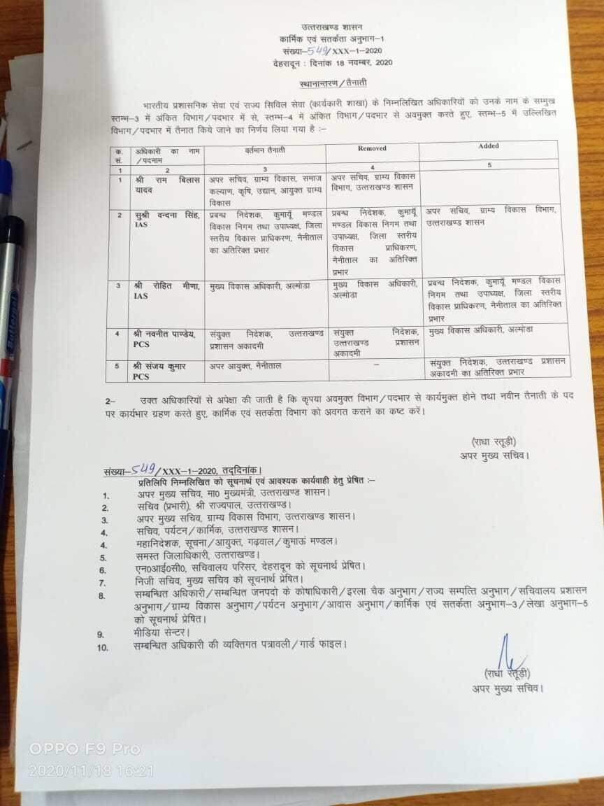 इसके अलावा आईएएस रामविलास यादव को अपर सचिव ग्रामीण विकास विभाग से हटाया गया, जबकि पीसीएस नवनीत पांडे को मुख्य विकास अधिकारी अल्मोड़ा बनाया गया। वही पीसीएस संजय कुमार को संयुक्त निदेशक उत्तराखंड प्रशासन अकादमी का अतिरिक्त प्रभार दिया गया।