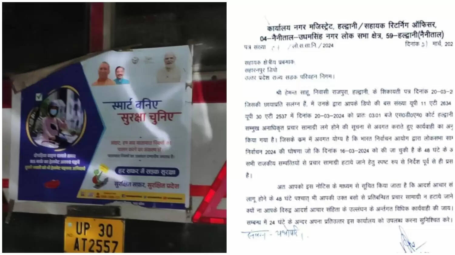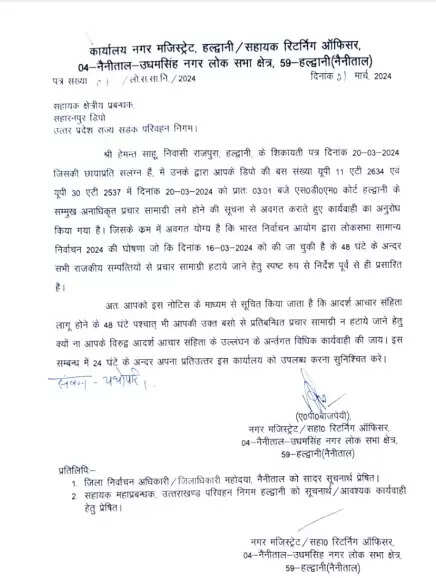 हल्द्वानी - आचार संहिता का पालन ना करने को लेकर जिला निर्वाचन की टीम लगातार सख्त एक्शन में है। आचार संहिता के उल्लंघन को लेकर दो नोटिस जारी किए गए हैं, आचार संहिता के उल्लंघन का एक नोटिस सहायक क्षेत्रीय प्रबंधक सहारनपुर डिपो उत्तर प्रदेश रोडवेज को जारी किया गया है, यूथ कांग्रेस प्रदेश उपाध्यक्ष हेमन्त साहू ने उत्तर प्रदेश परिवहन की सभी बसों से शिकायत के 24 घण्टे सीएम व पीएम के फोटो नही हटाये जाने पर गहरी नाराजगी जाहिर करते हुए कार्यवाही करने के लिए निर्वाचन आयोग को शिकायती पत्र सौपा था। अब नैनीताल उधम सिंह नगर के रिटर्निंग ऑफिसर ने कार्यालय से 24 जानते में जवाब माँगा है अन्यथा कार्यवाही की चेतावनी दी है।