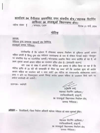 जब्कि दूसरा नोटिस प्रबंधक नैनीताल दुग्ध उत्पादक सहकारी संघ लिमिटेड को जारी किया गया है। वर्तमान में लोकसभा सामान्य निर्वाचन के दृष्टिगत आदर्श आचार संहिता प्रभावी है किन्तु दुग्ध संघ नैनीताल उत्तराखण्ड के नाम से सोशल नेटवर्क साईट “फेसबुक” पर संचालित पेज पर राजनीतिक सामग्री/फोटाग्राफ्स प्रसारित किया जाना प्रदर्शित हो रहा है, जो प्रथम दृष्टया आदर्श आचार संहिता का उल्लंघन प्रतीत होता है।