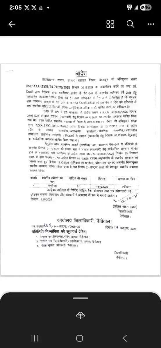 हल्द्वानी - DM रयाल ने 18 अक्टूबर को धनतेरस पर नैनीताल जिले में छुट्टी घोषित की, यह खुले रहेंगे, पढ़िए आदेश