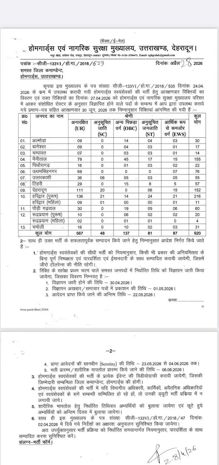 HomeGuard Bharti 2026 - उत्तराखंड में 920 पदों पर होगी होमगार्ड भर्ती, जानिए किस जिले के लिए कितने पद हैं स्वीकृत