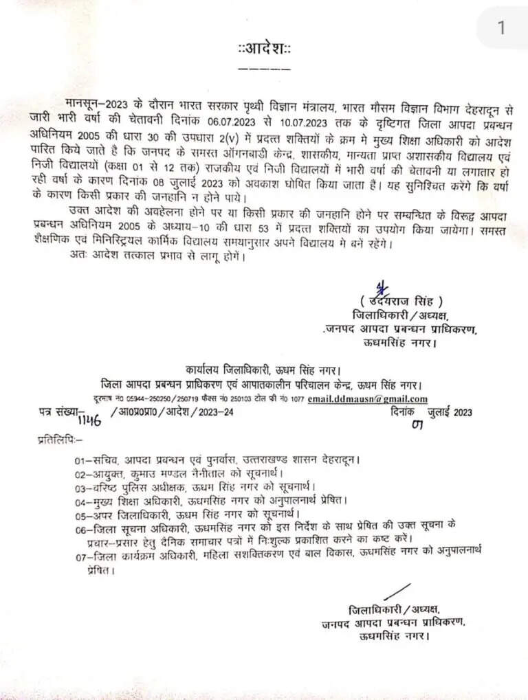 Kumaon News - पिछले 48 घंटों से हो रही भारी मूसलाधार बारिश नहीं जनजीवन अस्त-व्यस्त कर दिया है। वही उधम सिंह नगर में जिला अधिकारी उदय राज सिंह ने भारी बारिश के मद्देनजर 8 जुलाई शनिवार को सभी स्कूल आंगनबाड़ी बंद रखने के निर्देश दिए हैं। मौसम विभाग द्वारा जारी की गई चेतावनी के मद्देनजर उधम सिंह नगर जिले में कल शनिवार को कक्षा एक से 12वीं तक सभी सरकारी गैर सरकारी स्कूल और आंगनबाड़ी बंद रहेंगे