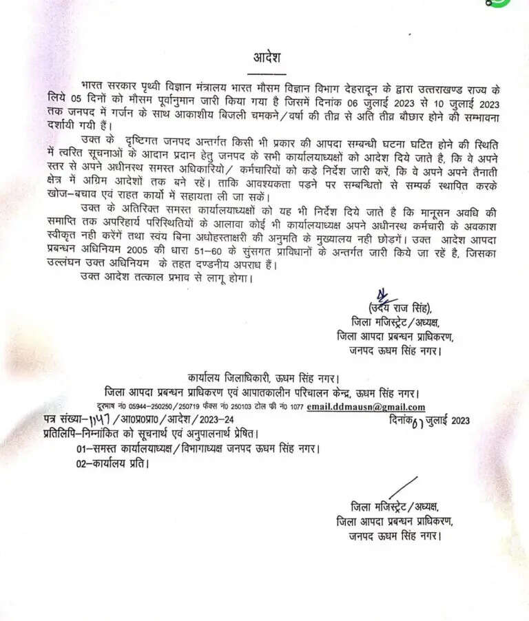 इसके साथ ही जिलाधिकारी ने एक और आदेश जारी किया है जिसमें सभी विभागों के अधिकारियों को स्पष्ट निर्देश दिए गए हैं कि मानसून के दृष्टिगत आपदा व अन्य दिक्कतों के मद्देनजर सभी कर्मचारी अपने मुख्यालयों को नहीं छोड़ेंगे और अलर्ट मोड में रहेंगे। और कर्मचारियों के अवकाश रद्द कर दिए गए हैं।