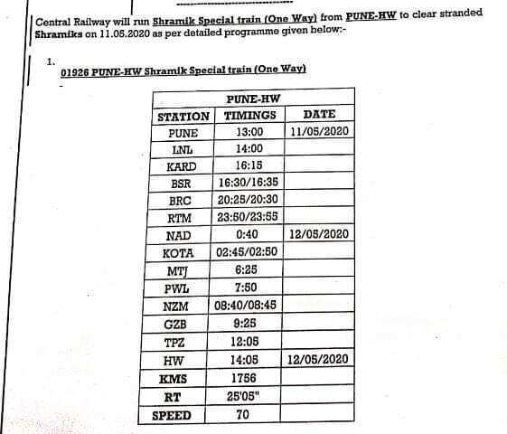 ही दोपहर 1 बजे पुणे से भी 1200 प्रवासियों को लेकर एक ट्रेन हरिद्वार के लिए प्रस्थान करेगी, उत्तराखंड पुलिस के फेसबुक पेज पर दी गई जानकारी के मुताबिक पुणे से चलने वाली ट्रेन का शेड्यूल जारी हो चुका है जो कि दोपहर 1 बजे पुणे से चलेगी।