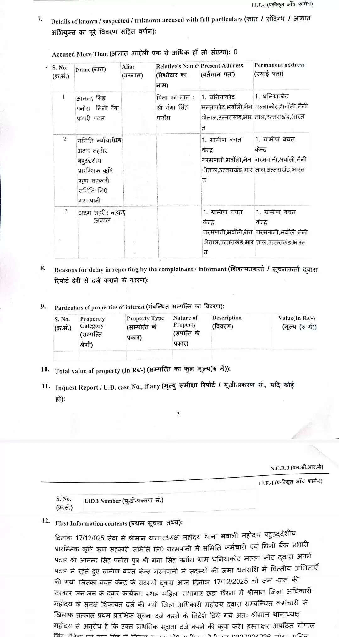 जिलाधिकारी के निर्देशानुसार कोतवाली भवाली में एफआईआर संख्या 042/25 दिनांक 18 दिसंबर 2025 को अभियोग पंजीकृत किया गया। इस मामले में शिकायतकर्ता गोपाल सिंह रौतेला, सचिव, बहुउद्देशीय प्रारम्भिक कृषि ऋण सहकारी समिति लिमिटेड गरमपानी, विकासखंड बेतालघाट, जनपद नैनीताल द्वारा प्रकरण दर्ज कराया गया।