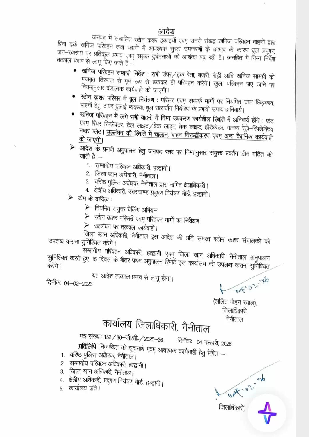 जिला खान अधिकारी नैनीताल को आदेश की प्रति सभी स्टोन क्रशर संचालकों को उपलब्ध कराने के निर्देश दिए गए हैं। वहीं, सम्भागीय परिवहन अधिकारी हल्द्वानी और जिला खान अधिकारी को 15 दिनों के भीतर प्रथम अनुपालन रिपोर्ट जिलाधिकारी कार्यालय को सौंपनी होगी।