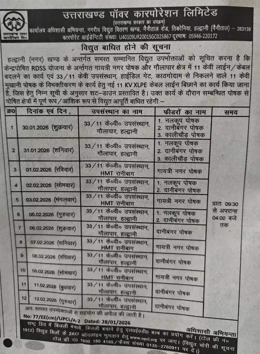 हल्द्वानी - उत्तराखंड पावर कॉरपोरेशन लिमिटेड (UPCL) ने 30 जनवरी से 12 फरवरी 2026 तक हल्द्वानी शहर के विभिन्न इलाकों में विद्युत आपूर्ति बाधित रहने की सूचना जारी की है। यह कटौती केंद्र सरकार की RDSS योजना के तहत 11 केवी लाइन/केबल बदलने, 33/11 केवी उपसंस्थानों में कार्य तथा 11 केवी XLPE केबल लाइन बिछाने के कार्य के कारण की जाएगी।
