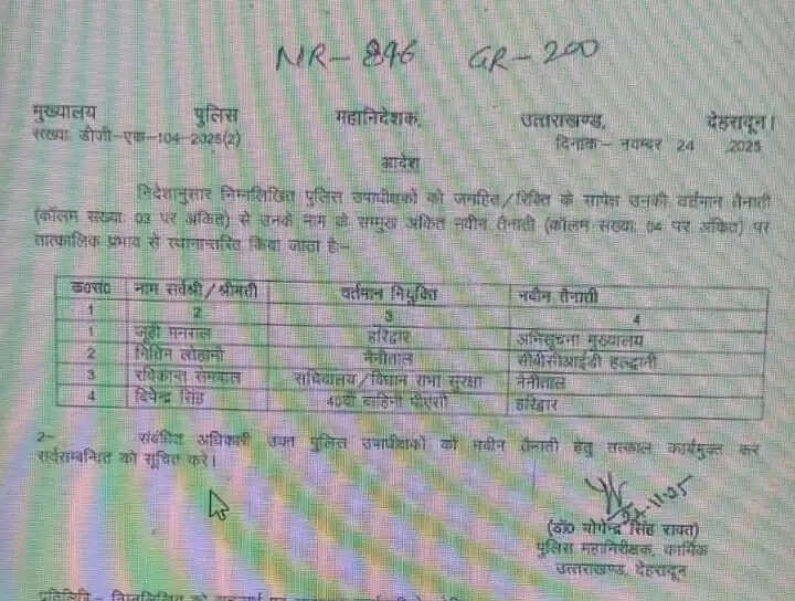 देहरादून - उत्तराखंड पुलिस विभाग में एक बार फिर बड़े पैमाने पर प्रशासनिक फेरबदल किया गया है। पुलिस मुख्यालय ने 24 नवंबर 2025 को नई तबादला सूची जारी करते हुए कई अधिकारियों के कार्यक्षेत्र और जिम्मेदारियों में तत्काल प्रभाव से बदलाव लागू कर दिए हैं। इस आदेश को पुलिस व्यवस्था को अधिक संगठित, प्रभावी और दक्ष बनाने की दिशा में उठाया गया कदम माना जा रहा है।