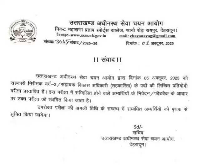 देहरादून - उत्तराखंड अधीनस्थ सेवा चयन आयोग (UKSSSC) द्वारा आयोजित की जाने वाली सहकारी निरीक्षक वर्ग-2 / सहायक विकास अधिकारी (सहकारिता) की 5 अक्टूबर 2025 को प्रस्तावित लिखित प्रतियोगी परीक्षा को स्थगित कर दिया गया है। आयोग द्वारा जारी आधिकारिक दस्तावेज में परीक्षा स्थगन की पुष्टि की गई है।