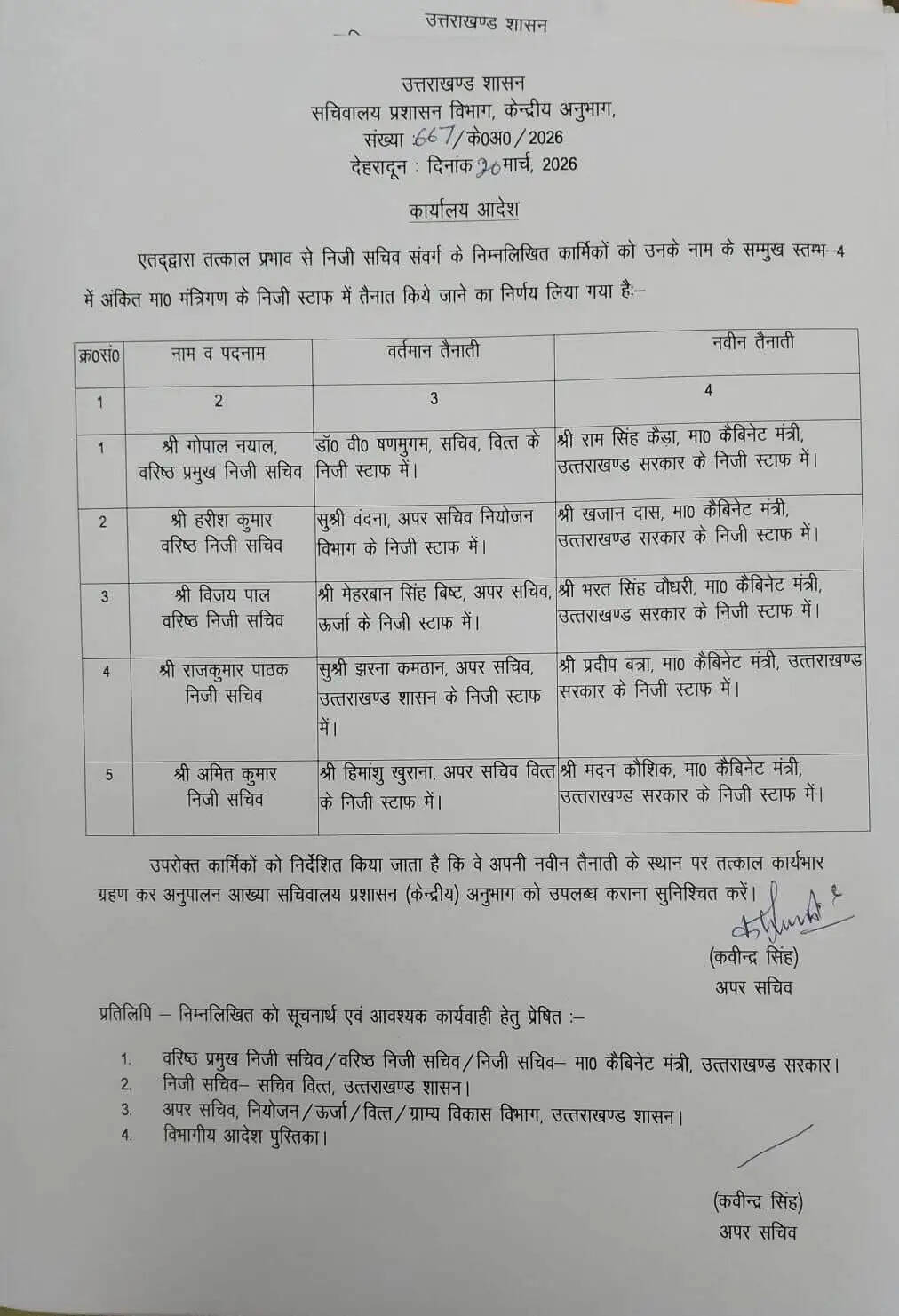 उत्तराखंड - कैबिनेट विस्तार के साथ नए मंत्रियों को मिला निजी स्टाफ, जानिए किसे कौन से मंत्री के साथ किया नियुक्त