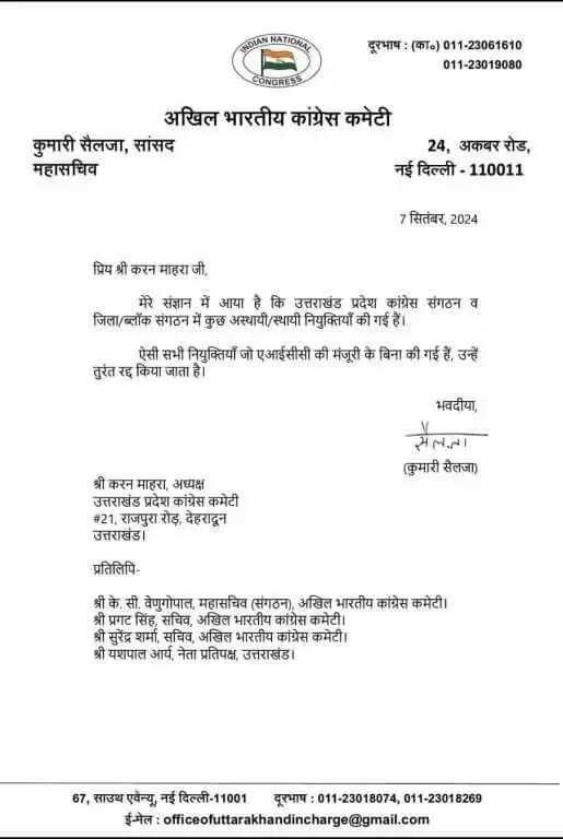 Uttarakhand Congress - उत्तराखंड कांग्रेस के प्रदेश अध्यक्ष करन माहरा को झटका मिला है. कांग्रेस की प्रदेश प्रभारी और हरियाणा की सिरसा सीट से सांसद कुमारी शैलजा ने उत्तराखंड कांग्रेस में बड़ी कार्रवाई की है. उत्तराखंड प्रदेश कांग्रेस संगठन व जिला ब्लॉक संगठन में अस्थाई अस्थाई नियुक्ति की गई है उन सभी नियुक्तियों को प्रदेश प्रभारी कुमारी शैलजा ने रद्द कर दिया है.