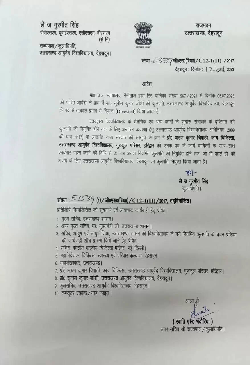 Uttarakhand News - उत्तराखंड के राज्यपाल गुरमीत सिंह ने आयुर्वेद विवि के कुलपति डॉ. सुनील कुमार जोशी को पद से हटा दिया है। साथ ही नियमित नियुक्ति तक गुरुकुल के प्रो. अरुण कुमार त्रिपाठी को आयुर्वेद विवि के कुलपति का अंतरिम चार्ज दिया गया है। राजभवन ने यह कार्यवाही हाईकोर्ट के आदेश पर की है।