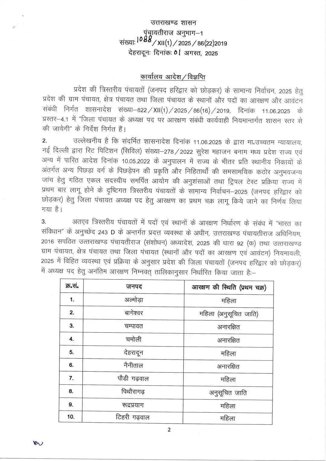उत्तराखंड - जिला पंचायत अध्यक्ष पदों के लिए आरक्षण सूची जारी, नैनीताल देहरादून जिलों के बदले समीकरण